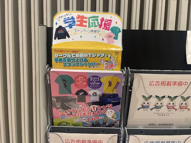 北九州市立大学様がパンフレットスタンドの掲示物を今年から一般企業に開放する試みをはじめましたので、弊社の新リーフレットを掲示しています。サークル・ゼミ仲間とお揃いTシャツを作ってみませんか。1枚からでも制作できます。学生さん、大学関係者の皆様、お気軽にお問い合わせください。