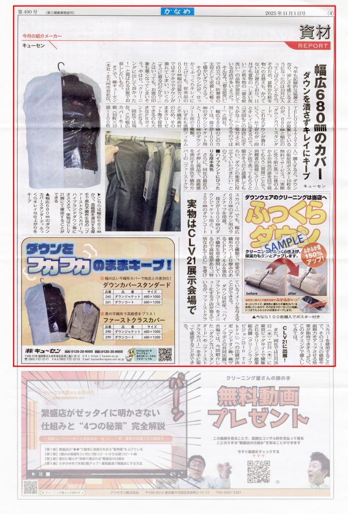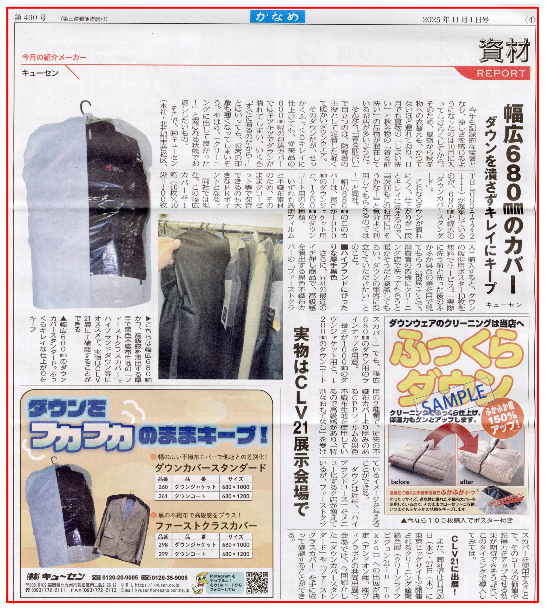 「かなめ新聞(2025年11月1日第490号)」にて、「今月の紹介メーカー」として弊社商品のふっくらキレイな仕上がりをキープできる【ダウンカバースタンダード】とハイブランドにピッタリな厚手黒色の【ファーストクラスカバー】が紹介されました。11月26日(水)・27日(木)に東京ビッグサイトで開催されるCLV21に共同出展(『アンドオン株式会社』様及び『株式会社ヴィノラボ』様)することになりましたので、会場で実物を手に取って確認することができます。