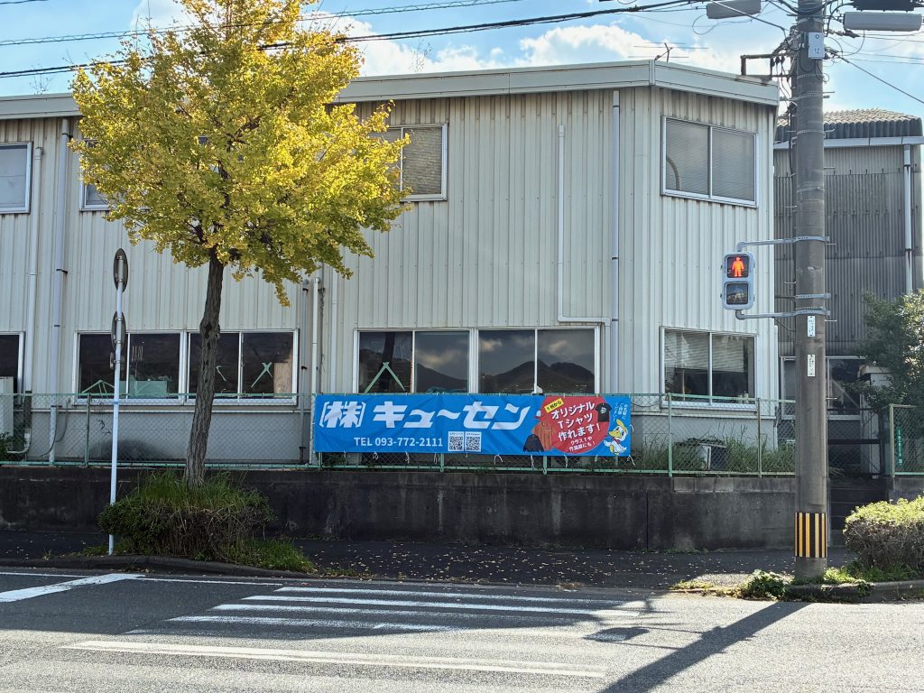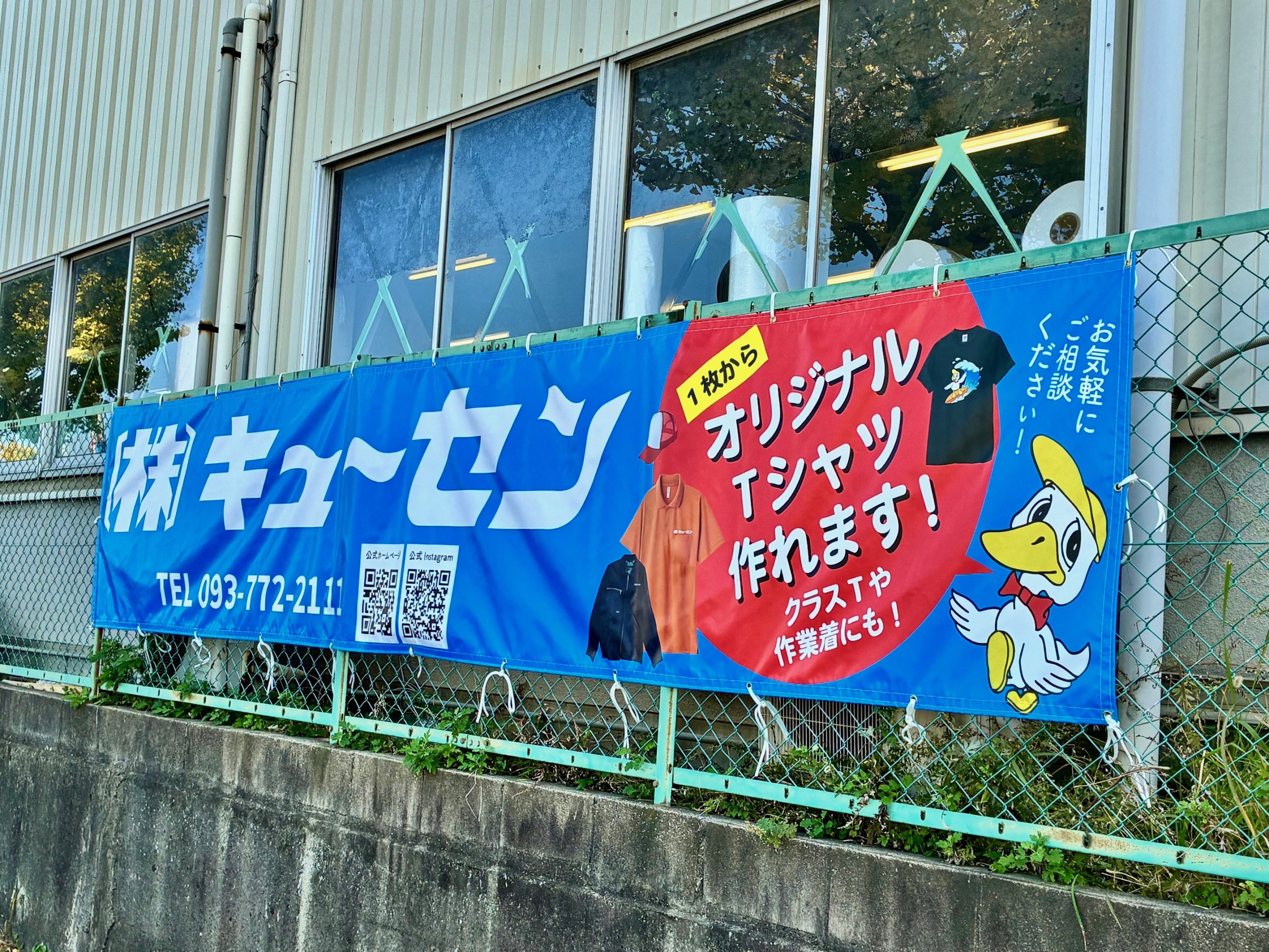 完成!当社建屋の横に「1枚から作れるオリジナルTシャツ」の垂れ幕を掲示しました。